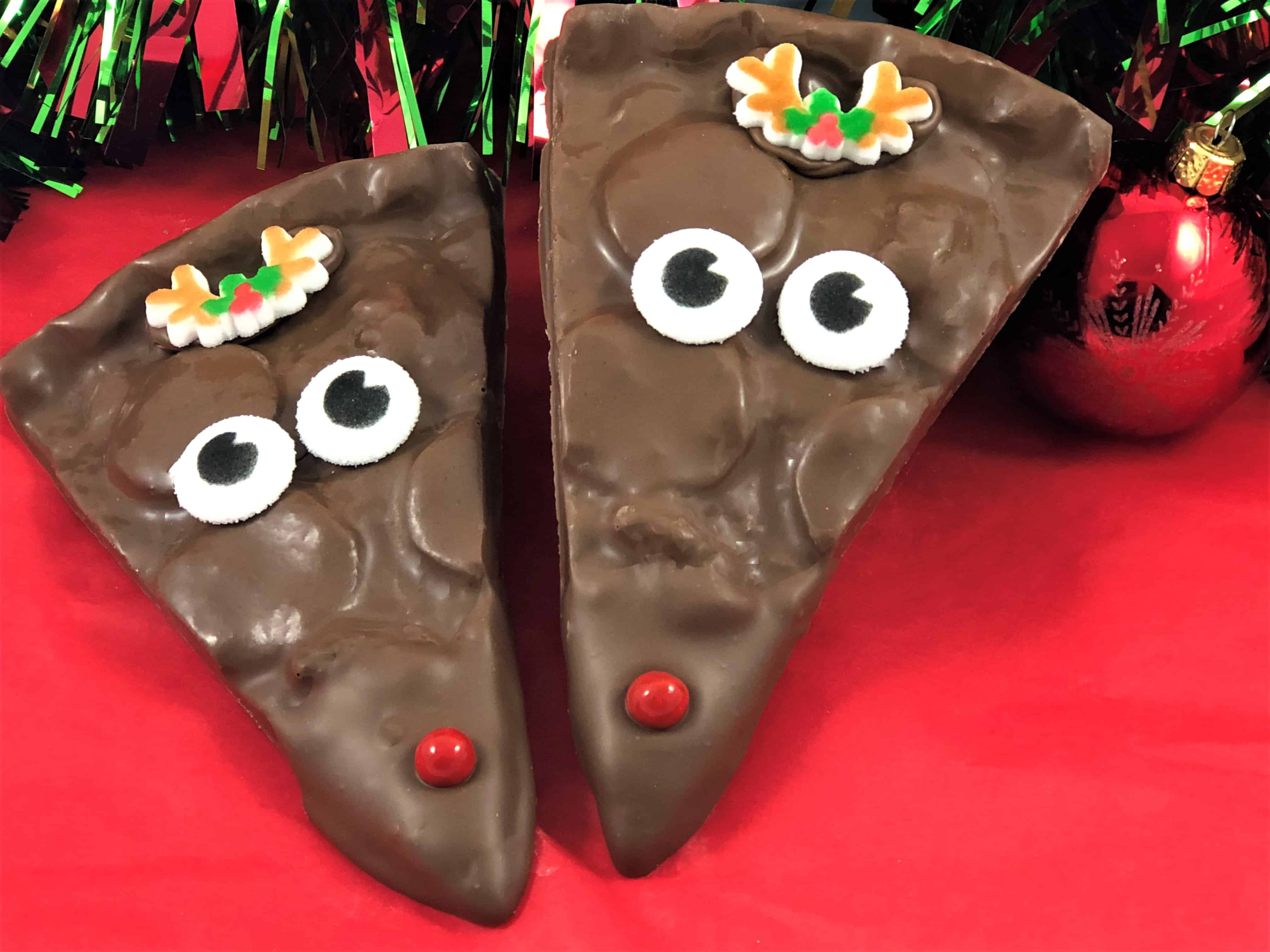 If you’re like us, then you know there’s no wrong time for pizza. Christmas is no exception! Our signature chocolate reindeer pizza is well worth the trademark. Unique, festive and adorable, this slice of gourmet Chocolate Pizza pie isn’t just creative and cute, it’s delicious. Our Chocolate Pizzas are made with velvety smooth chocolate blended with our homemade English toffee for a taste that’s uniquely buttery sweet. Topped off with a sugar nose, eyes and antlers, we’ve turned our special recipe into a holiday masterpiece.